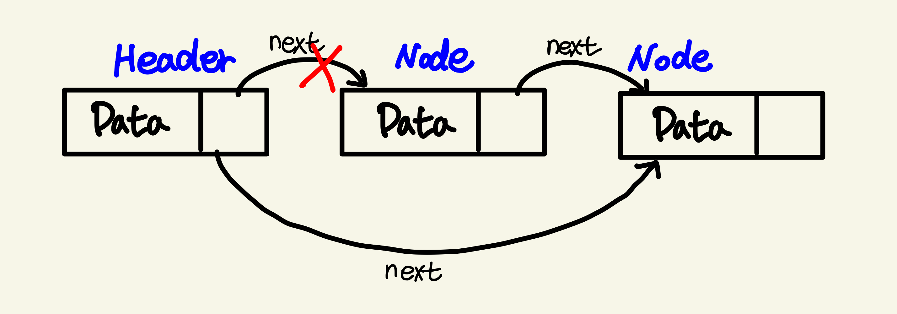 값이 제거되는 방식은 그림과 같이 삭제 대상 노드의 이전 노드가 삭제 대상 다음 노드를 가리키게 하고 해당 노드는 삭제됩니다.