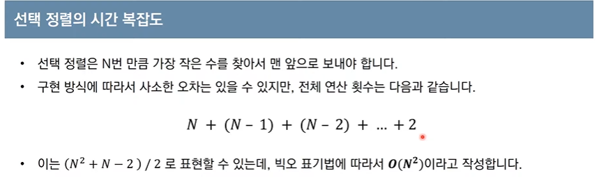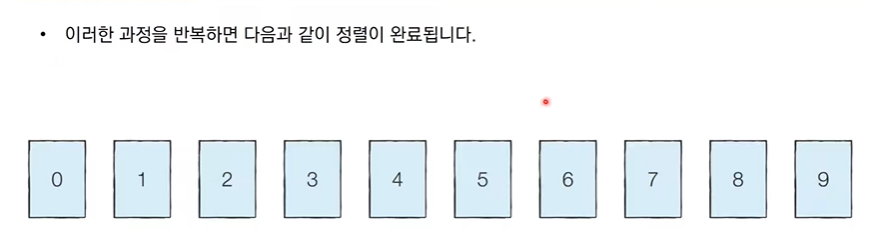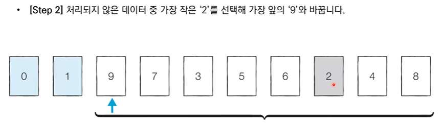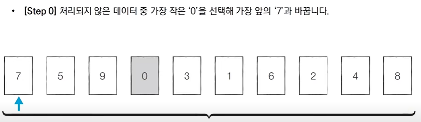 처리되지 않은 데이터 중에서 가장 작은 데이터를 선택해 맨 앞에 있는 데이터와 바꾸는 것을 반복합니다.
