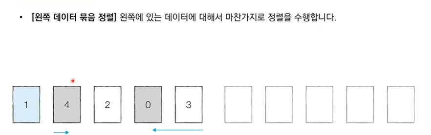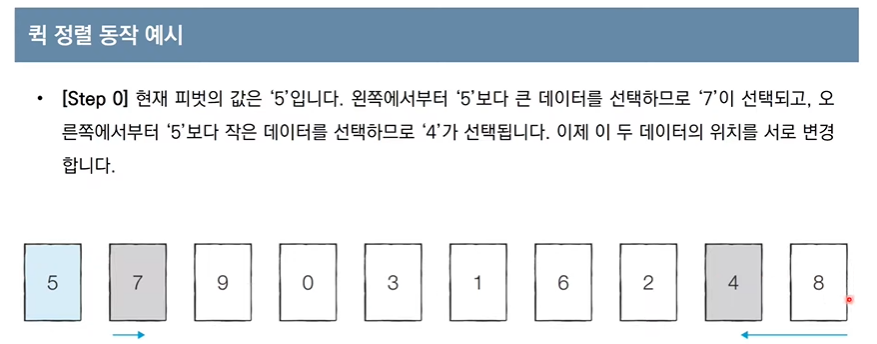 - 기준 데이터를 설정하고 그 기준보다 큰 데이터와 작은 데이터의 위치를 바꾸는 방법