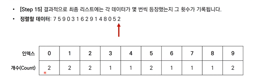- 데이터의 개수가 N, 데이터(양수) 중 최댓값이 K일 때 최악의 경우에도 수행 시간 O(N+K)를 보장