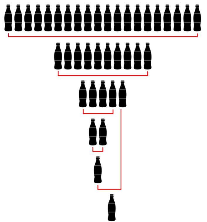 문제를 풀던 상빈이는 콜라 문제의 완벽한 해답을 찾았습니다. 상빈이가 푼 방법은 아래 그림과 같습니다. 우선 콜라 빈 병 20병을 가져가서 10병을 받습니다. 받은 10병을 모두 마신 뒤, 가져가서 5병을 받습니다. 5병 중 4병을 모두 마신 뒤 가져가서 2병을 받고, 또 2병을 모두 마신 뒤 가져가서 1병을 받습니다. 받은 1병과 5병을 받았을 때 남은 1병을 모두 마신 뒤 가져가면 1병을 또 받을 수 있습니다. 이 경우 상빈이는 총 10 + 5 + 2 + 1 + 1 = 19병의 콜라를 받을 수 있습니다.