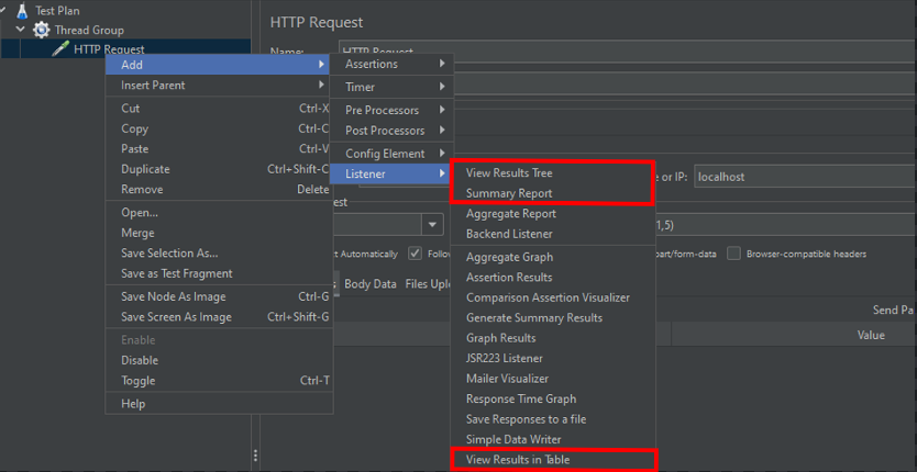 7. Listener(ViewResultsTree, Summary Report, ViewResults in Table) 추가