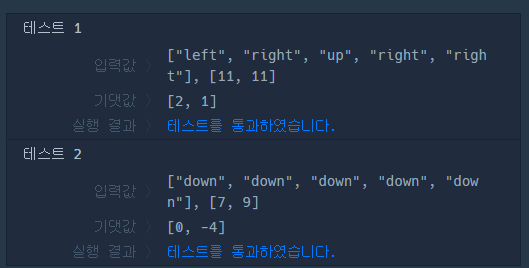 머쓱이는 RPG게임을 하고 있습니다. 게임에는 up, down, left, right 방향키가 있으며 각 키를 누르면 위, 아래, 왼쪽, 오른쪽으로 한 칸씩 이동합니다. 예를 들어 [0,0]에서 up을 누른다면 캐릭터의 좌표는 [0, 1], down을 누른다면 [0, -1], left를 누른다면 [-1, 0], right를 누른다면 [1, 0]입니다. 머쓱이가 입력한 방향키의 배열 keyinput와 맵의 크기 board이 매개변수로 주어집니다. 캐릭터는 항상 [0,0]에서 시작할 때 키 입력이 모두 끝난 뒤에 캐릭터의 좌표 [x, y]를 return하도록 solution 함수를 완성해주세요.