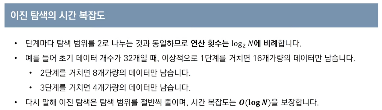 - 정렬되어 있는 리스트에서 탐색범위를 절반씩 좁혀가며 데이터를 탐색하는 방법