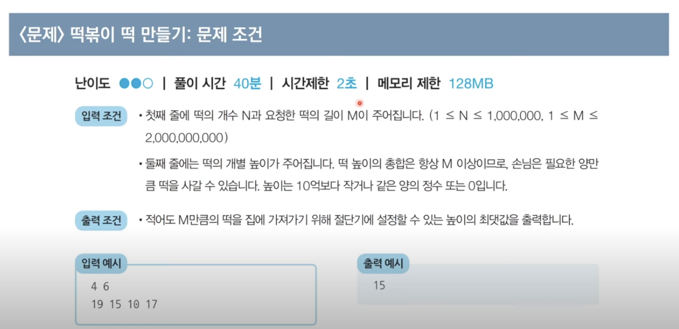 - 일반적으로 코딩테스트에서 파라메트릭 서치 문제는 이진 탐색을 이용하여 해결할 수 있습니다.