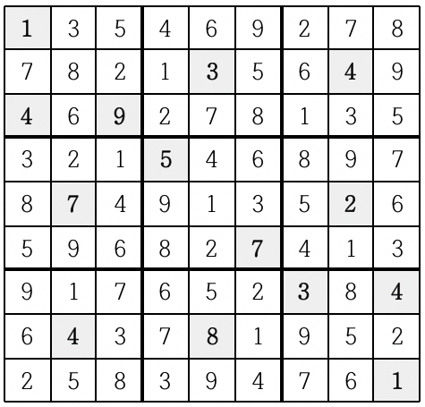 위의 예의 경우, 첫째 줄에는 1을 제외한 나머지 2부터 9까지의 숫자들이 이미 나타나 있으므로 첫째 줄 빈칸에는 1이 들어가야 한다.