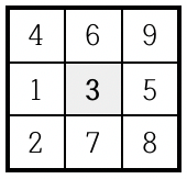 - 굵은 선으로 구분되어 있는 3x3 정사각형 안에도 1부터 9까지의 숫자가 한 번씩만 나타나야 한다.