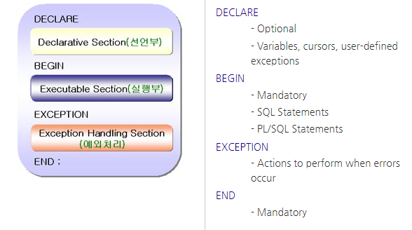 - PL/SQL은 프로그램을 논리적인 블록으로 나누는 구조화된 블록언어