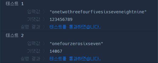 영어가 싫은 머쓱이는 영어로 표기되어있는 숫자를 수로 바꾸려고 합니다. 문자열 numbers가 매개변수로 주어질 때, numbers를 정수로 바꿔 return 하도록 solution 함수를 완성해 주세요.
