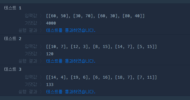 가장 긴 가로 길이와 세로 길이가 각각 80, 70이기 때문에 80(가로) x 70(세로) 크기의 지갑을 만들면 모든 명함들을 수납할 수 있습니다. 하지만 2번 명함을 가로로 눕혀 수납한다면 80(가로) x 50(세로) 크기의 지갑으로 모든 명함들을 수납할 수 있습니다. 이때의 지갑 크기는 4000(=80 x 50)입니다.